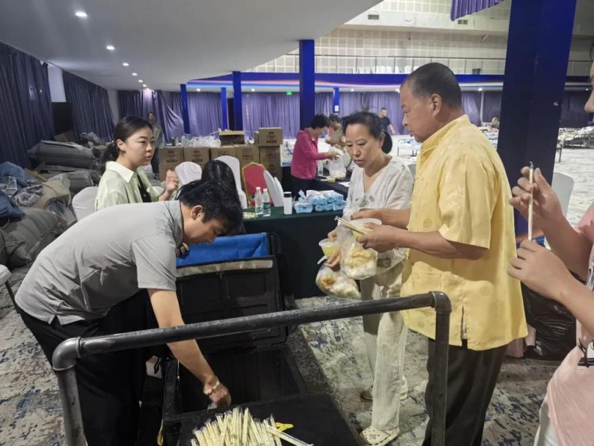 在稻香湖景酒店安置点内,苏家坨镇领导带领安置组工作人员一起,规划工作区和休息区、安装床和铺床单,准备生活用品。傍晚,来自各转移点位的村民在工作人员引导下陆续抵达,安置点工作人员有序引导村民登记、安排床铺、帮忙拎行李、指引路线。“您快歇歇,喝口水”“有什么需要您尽管跟我们说”一句句暖心的话语让村民们原本紧绷的神经渐渐放松,安置点内瞬间充满了温情与暖意。