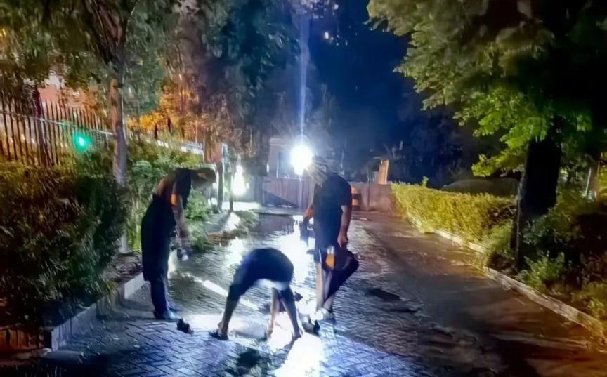 地下车库入口处,物业人员老张带着队员加固沙袋墙。“每个车库堆了100多个沙袋,刚才巡查时路面基本没积水。”他的手电筒光束扫过新换的排水管,雨水正打着旋儿流入下水道。3公里外的农大南路33号院,另一组队员正在清理排水箅子上的落叶。