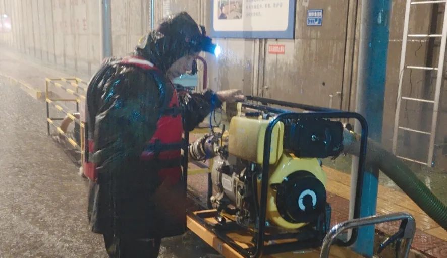 为应对此次强降雨,队员们从两天前就进驻点位,检查设备、清理排水口,时刻监测雨情变化。此刻,他们踩着没过脚踝的积水,交替掀开雨水箅子,将抽水泵的水带一一接好,浑浊的积水顺着三条管道汩汩排出,溅起的水花打湿了他们的裤腿。这样的彻夜值守,在汛期早已成为常态。