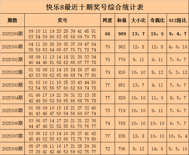 福彩快乐8第2025308期开出奖号:05 07 08 11 16 17 21 25 29 36 37 39 41 42 46 53 59 62 75 77,其中奖号跨度开出72,和值开出706,大小比开出8:12,奇偶比开出14:6,012路比开出5:5:10。