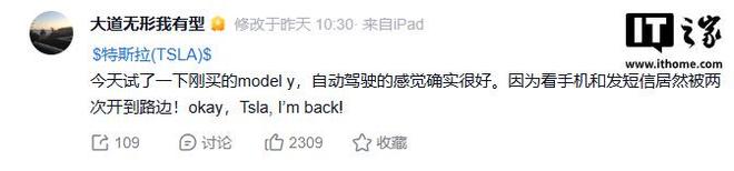 段永平表示,在试驾过程中自动驾驶的体验“确实很好”,但因自己在途中看手机和发短信,居然两次被车辆系统强制接管并开到路边停车。他还写道:“Okay, Tsla, I'm back!”,暗示其对特斯拉的重新认可。